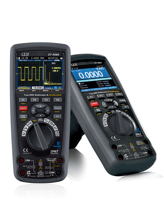 DT-9989 Professional industrial True RMS digital multimeter with oscilloscope functions and TFT color LCD display, providing fast A/D conversion, high accuracy, built-in data logging functions and Meterbox iMM software and cloud server support to transfer data to the customer's smartphone for editing and storage.